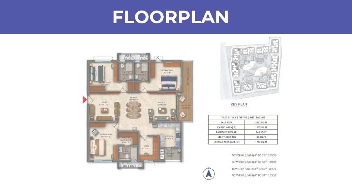 | 3 BHK + 3T + Study | 2462 Sq.Ft. | Rs. 1.96 Cr* Onwards Price Breakup |